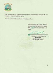 The Executive Order also outlines a dispute resolution mechanism to address conflicts arising from the implementation of the order. These disputes will be handled through arbitration under the rules of the Liberian Chamber of Commerce, ensuring that any issues are resolved fairly and transparently. Importantly, the order clarifies that it “may not be interpreted to interfere with or diminish the existing rights of any Eligible Users obtained under previous agreements with the Government of Liberia,” thus balancing the need for reform with respect for existing contracts.