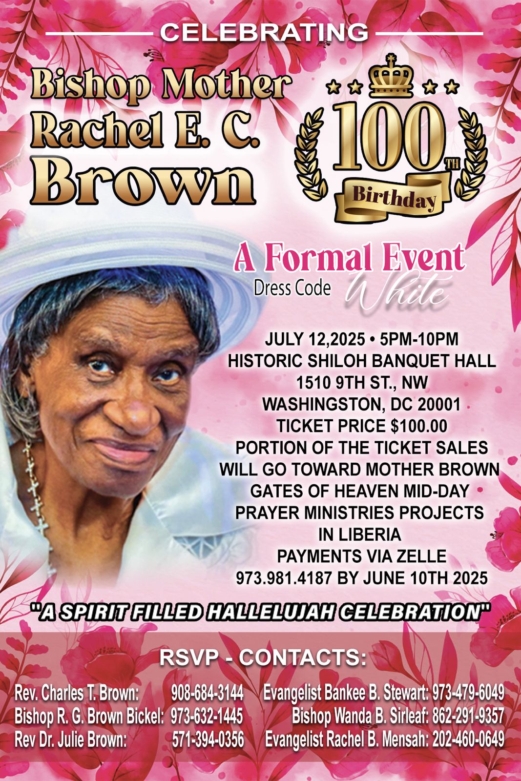 Uncategorized Celebrating Bishop Mother Rachel E. C. Brown 100th Birthday – A Formal Event July 12, 2025 May 27, 2025 1 min read 2264 Post Views: 1,980 Continue Reading Previous: William George CollinsNext: Professor John T. Woods Trending Now Maima Daba Gray 1 Maima Daba Gray October 15, 2025 Cordelia Famata Ammons 2 Cordelia Famata Ammons October 15, 2025 Mrs. Rose Greaves Kokro 3 Mrs. Rose Greaves Kokro October 13, 2025 Mr. Mark S. Wilson 4 Mr. Mark S. Wilson October 12, 2025 Olivia M. Horton 5 Olivia M. Horton October 11, 2025 Ernest Napoleon Slueue Jones Sr. 6 Ernest Napoleon Slueue Jones Sr. October 11, 2025 Related Stories 2 min read Uncategorized Seyeanen Lucia “Cece” Gilman September 21, 2025 3391 1 min read Uncategorized Suspected Viral Hemorrhagic Fever (VHF) Case September 10, 2025 494 2 min read Uncategorized Mr. Colbert R. Watkins August 22, 2025 2369 1 min read Uncategorized Death Announcement Mr. Joseph Y. Zubah. August 7, 2025 2679 4 min read Uncategorized Country with a Liberian Twist: Mon Rovîa Debuts at the Opry in Nashville, TN – — Captivating Audiences with hit single, ‘Heavy Foot’ August 3, 2025 1742 1 min read Uncategorized Dee Tweh Live at Essington Queen Contest & Ball – Saturday August 9 / 8pm – 2am July 30, 2025 1229