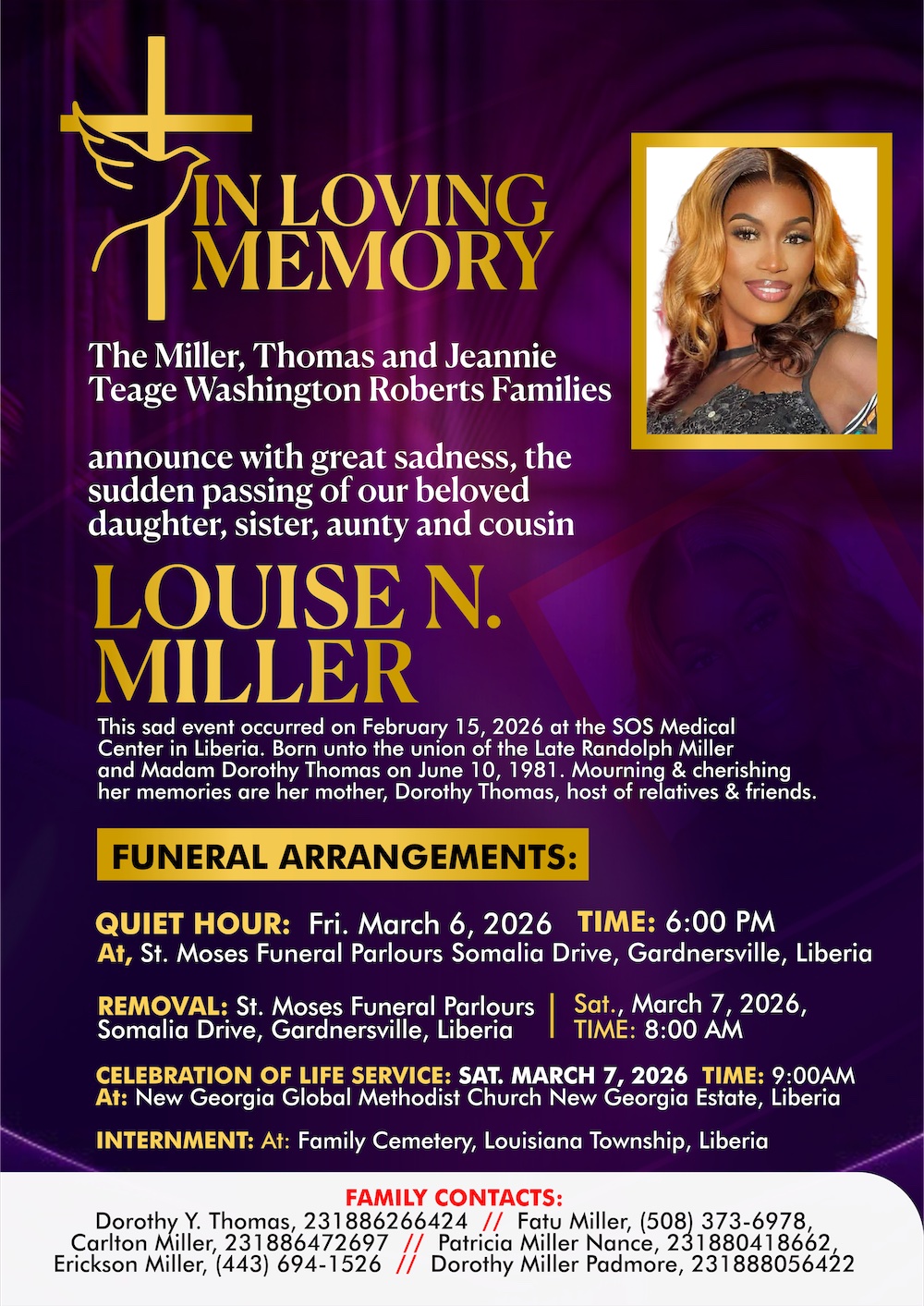 Death Announcement Louise N. Miller February 24, 2026 1 min read 596 Post Views: 504 Continue Reading Previous: Police Arrest 61-Year-Old Woman Accused of Hacking Three Minors to Death in District 9 Trending Now Louise N. Miller 1 Louise N. Miller February 24, 2026 Police Arrest 61-Year-Old Woman Accused of Hacking Three Minors to Death in District 9 2 Police Arrest 61-Year-Old Woman Accused of Hacking Three Minors to Death in District 9 February 24, 2026 Gov’t Bans “National Fula Security” Amid Fears of Extremism Spillover 3 Gov’t Bans “National Fula Security” Amid Fears of Extremism Spillover February 23, 2026 Richard Edwin Cunningham 4 Richard Edwin Cunningham February 22, 2026 Rudolph Napoleon Bonaparte Logan, Jr. 5 Rudolph Napoleon Bonaparte Logan, Jr. February 19, 2026 Writ of Re-Summons – (To Whom It May Concern) 6 Writ of Re-Summons – (To Whom It May Concern) February 18, 2026 Related Stories 1 min read Death Announcement Richard Edwin Cunningham February 22, 2026 1108 1 min read Death Announcement Rudolph Napoleon Bonaparte Logan, Jr. February 19, 2026 2469 1 min read Death Announcement Winston D. White February 18, 2026 1795 2 min read Death Announcement Charles Sotee Dennis, Jr. February 14, 2026 2326 1 min read Death Announcement Korpu K. Tarhun February 13, 2026 1826 1 min read Death Announcement Alvin Delano Nelson “Putu” February 12, 2026 2005