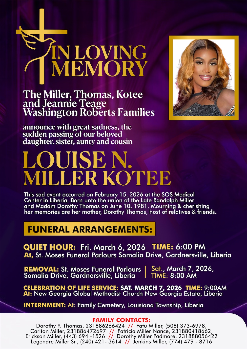 Death Announcement Louise N. Miller Kotee February 24, 2026 1 min read 3242 Post Views: 2,710 Continue Reading Previous: Police Arrest 61-Year-Old Woman Accused of Hacking Three Minors to Death in District 9Next: KOJO JEFFERIES ADORKOR Trending Now Richards & Coleman Family Reunion 2026 1 Richards & Coleman Family Reunion 2026 April 10, 2026 IN LOVING MEMORY OF MR. S. ALFRED P. HARRIS, Jr. 2 IN LOVING MEMORY OF MR. S. ALFRED P. HARRIS, Jr. April 10, 2026 Prof. Francis B. S. Johnson 3 Prof. Francis B. S. Johnson April 8, 2026 In Loving Memory of Our Beloved Sister Gloria N. Nah 4 In Loving Memory of Our Beloved Sister Gloria N. Nah April 7, 2026 Stalled RIA Highway Project Claims More Victims — Silence from Public Works continues 5 Stalled RIA Highway Project Claims More Victims — Silence from Public Works continues April 7, 2026 Alfred S. Mitchell 6 Alfred S. Mitchell April 7, 2026 Related Stories 2 min read Death Announcement IN LOVING MEMORY OF MR. S. ALFRED P. HARRIS, Jr. April 10, 2026 851 2 min read Death Announcement Prof. Francis B. S. Johnson April 8, 2026 1112 2 min read Death Announcement In Loving Memory of Our Beloved Sister Gloria N. Nah April 7, 2026 1509 2 min read Death Announcement Alfred S. Mitchell April 7, 2026 1312 1 min read Death Announcement Sando Comfort Kemokai Reeves April 6, 2026 1922 2 min read Death Announcement In Loving Memory of Mrs. Elizabeth Tennessee Perry Bernard April 4, 2026 1714