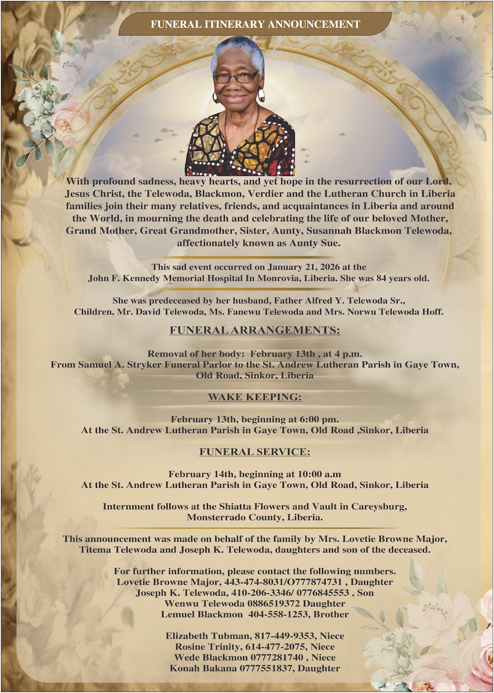 Death Announcement Susannah Blackmon Telewoda February 4, 2026 1 min read 72 Post Views: 62 Continue Reading Previous: Ivanhoe Atlantic CEO Quits as Guinea Roadblocks Threaten Liberia Rail Deal Trending Now Susannah Blackmon Telewoda 1 Susannah Blackmon Telewoda February 4, 2026 Ivanhoe Atlantic CEO Quits as Guinea Roadblocks Threaten Liberia Rail Deal 2 Ivanhoe Atlantic CEO Quits as Guinea Roadblocks Threaten Liberia Rail Deal February 4, 2026 Missionary Esther Wheagar 3 Missionary Esther Wheagar February 4, 2026 Zena P. De-Vamah 4 Zena P. De-Vamah January 31, 2026 Deacon Charles T. Collins 5 Deacon Charles T. Collins January 30, 2026 Deaconess J. Eva Coleman George 6 Deaconess J. Eva Coleman George January 30, 2026 Related Stories 5 min read Death Announcement Missionary Esther Wheagar February 4, 2026 420 1 min read Death Announcement Zena P. De-Vamah January 31, 2026 1678 2 min read Death Announcement Deacon Charles T. Collins January 30, 2026 1768 1 min read Death Announcement Deaconess J. Eva Coleman George January 30, 2026 2275 1 min read Death Announcement In Loving Memory of Mrs Martha Freeman January 28, 2026 3039 1 min read Death Announcement Andrew Ngafua Fatorma January 28, 2026 1653