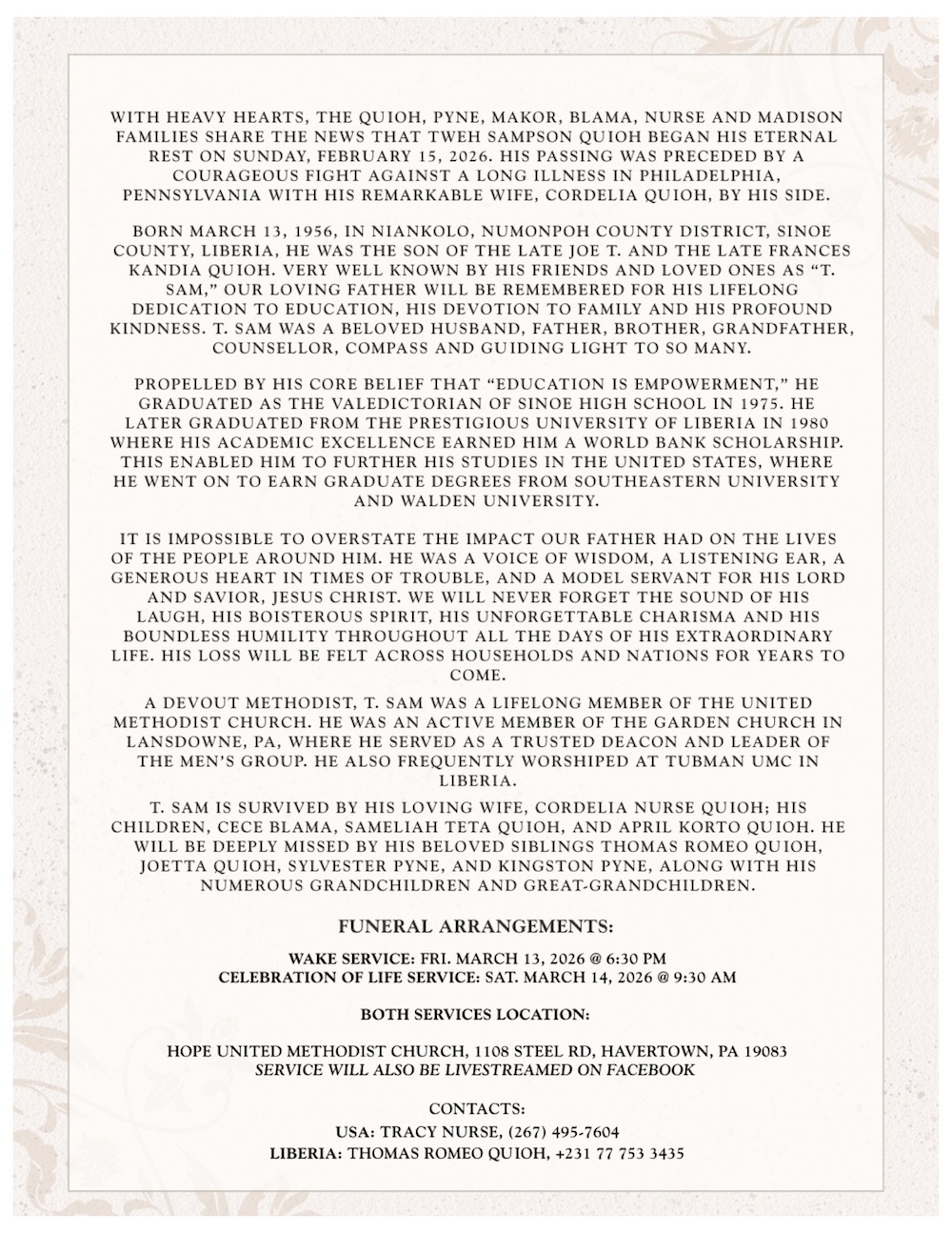 Death Announcement T. Sampson Quioh February 27, 2026 1 min read 141 Post Views: 127 Continue Reading Previous: Arthur Bill Johns Trending Now T. Sampson Quioh 1 T. Sampson Quioh February 27, 2026 Arthur Bill Johns 2 Arthur Bill Johns February 27, 2026 Emperor Ralph Toe Wulah, Sr. 3 Emperor Ralph Toe Wulah, Sr. February 27, 2026 Henryton G. Brewer, Sr. 4 Henryton G. Brewer, Sr. February 26, 2026 Partina Clement Douglas 5 Partina Clement Douglas February 26, 2026 Celebrating Dave Garnett’s 70th Birthday, Masonic Temple, Monrovia – February 24, 2026 6 Celebrating Dave Garnett’s 70th Birthday, Masonic Temple, Monrovia – February 24, 2026 February 25, 2026 Related Stories 2 min read Death Announcement Emperor Ralph Toe Wulah, Sr. February 27, 2026 207 2 min read Death Announcement Henryton G. Brewer, Sr. February 26, 2026 803 2 min read Death Announcement Partina Clement Douglas February 26, 2026 875 1 min read Death Announcement KOJO JEFFERIES ADORKOR February 25, 2026 1763 1 min read Death Announcement Louise N. Miller Kotee February 24, 2026 1974 1 min read Death Announcement Richard Edwin Cunningham February 22, 2026 1579