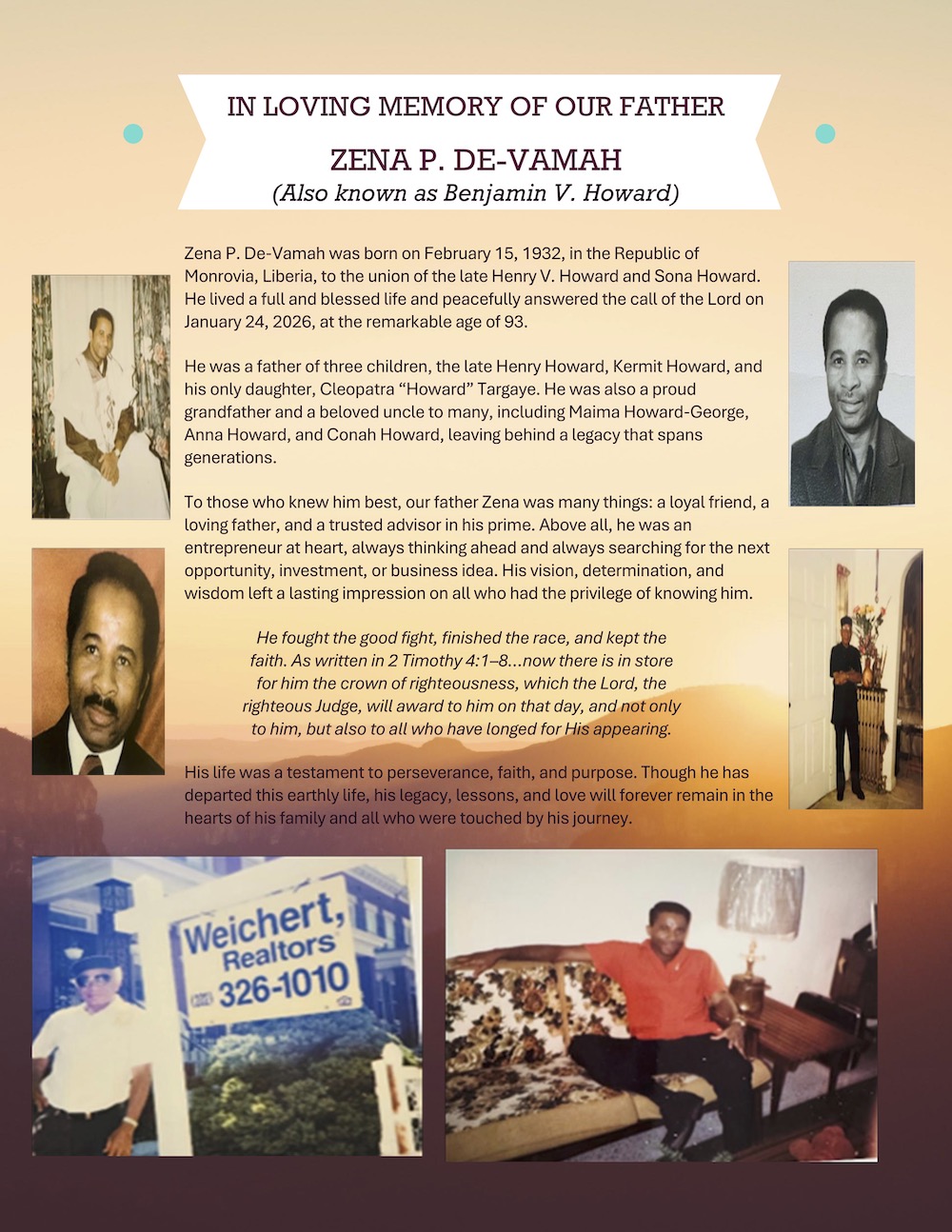Death Announcement Zena P. De-Vamah January 31, 2026 1 min read 54 Post Views: 43 Continue Reading Previous: Deacon Charles T. Collins Trending Now Zena P. De-Vamah 1 Zena P. De-Vamah January 31, 2026 Deacon Charles T. Collins 2 Deacon Charles T. Collins January 30, 2026 Deaconess J. Eva Coleman George 3 Deaconess J. Eva Coleman George January 30, 2026 In Loving Memory of Mrs Martha Freeman 4 In Loving Memory of Mrs Martha Freeman January 28, 2026 Andrew Ngafua Fatorma 5 Andrew Ngafua Fatorma January 28, 2026 Reforming the University of Liberia for the 21st Century: Why The Time Is Now 6 Reforming the University of Liberia for the 21st Century: Why The Time Is Now January 28, 2026 Related Stories 2 min read Death Announcement Deacon Charles T. Collins January 30, 2026 411 1 min read Death Announcement Deaconess J. Eva Coleman George January 30, 2026 577 1 min read Death Announcement In Loving Memory of Mrs Martha Freeman January 28, 2026 1810 1 min read Death Announcement Andrew Ngafua Fatorma January 28, 2026 1100 2 min read Death Announcement In Loving Memory of Caroline Satta Jangaba January 28, 2026 1577 3 min read Death Announcement Dalrine Satta Watson January 28, 2026 1185